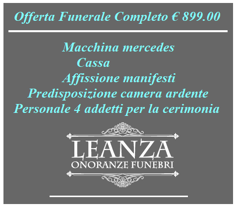 L'agenzia funebre Leanza cerca di proporre soluzioni per andare incontro alle necessità della clientela. Proprio in virtù di questo motivo offre una particolare promozione che prevede l’organizzazione di un funerale al costo di € 890,00.